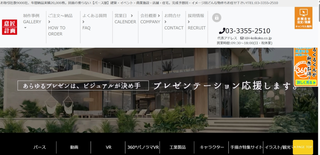 意匠計画は、1989年創業で年間4,000件以上の実績を誇る老舗の制作会社です。すべての工程を社内生産で進める体制が信頼を集めており、フォトリアルなCGから温かみのある手描きパースまで幅広く対応しています。