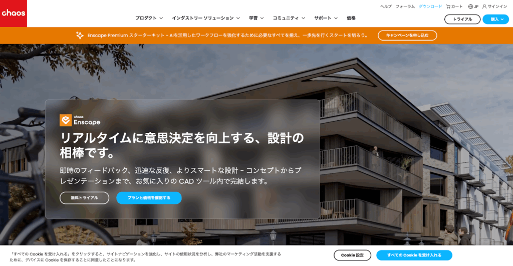 Enscapeは、設計中にリアルタイムでビジュアライゼーションを行えるレンダリングツールです。AI機能のVerasやAI Enhancerによって、ビジュアル品質を自動で向上させ、短時間で複数案の検討が可能です。