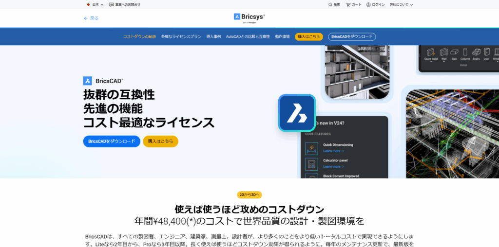 BricsCADは、AutoCADユーザーにも馴染みやすい操作性と高い互換性を備えたCADソフトです。2D製図から3Dモデリング、さらに、BIMやメカニカル設計まで1つの環境で対応できるため、複数のソフトを使い分ける手間を省けます。