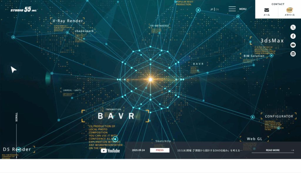 CGや手描き・アニメーション・VR・360°パノラマなど幅広い表現方法に対応しています。さらに、BIM支援業務やデジタルサイネージ、プロジェクションマッピングなどの先端サービスも展開しています。