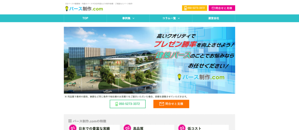 静止画パースだけでなく、CGアニメーションにも対応しており、完成イメージをより直感的に伝えたい場面でも重宝するのが特徴です。見積もりは無料で、予算や目的に応じた柔軟な提案を行っているため、初めて外注する場合でも相談しやすい制作会社といえるでしょう。