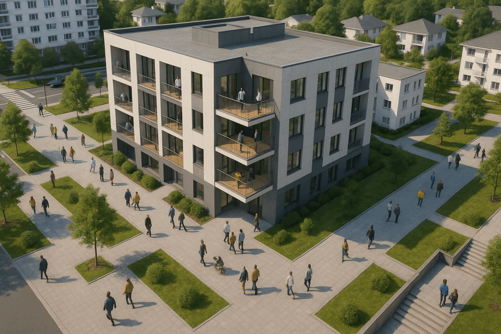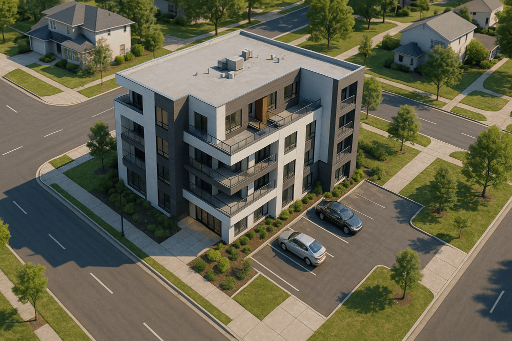 マンションや住宅の設計における鳥瞰パースは、建物全体の配置や外構、隣接地との関係を直感的に伝えるために利用されます。住戸配置や共用スペース・駐車場・植栽などをまとめて表現できるため、住環境の雰囲気をクライアントに伝えやすいのが特徴です。