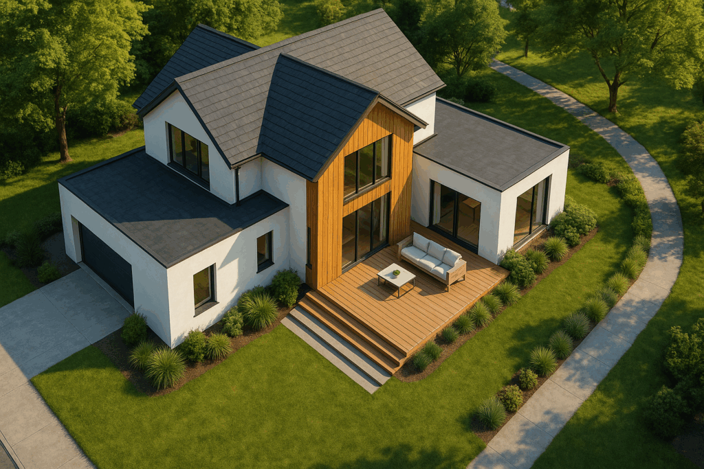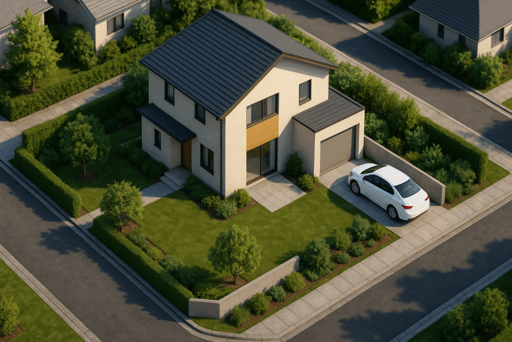 鳥瞰パースを活用することで、複数の設計案を俯瞰的に比較しやすくなります。上空からの視点で全体を見渡せるため、配置バランス、外構デザインの違いを直感的に把握できます。