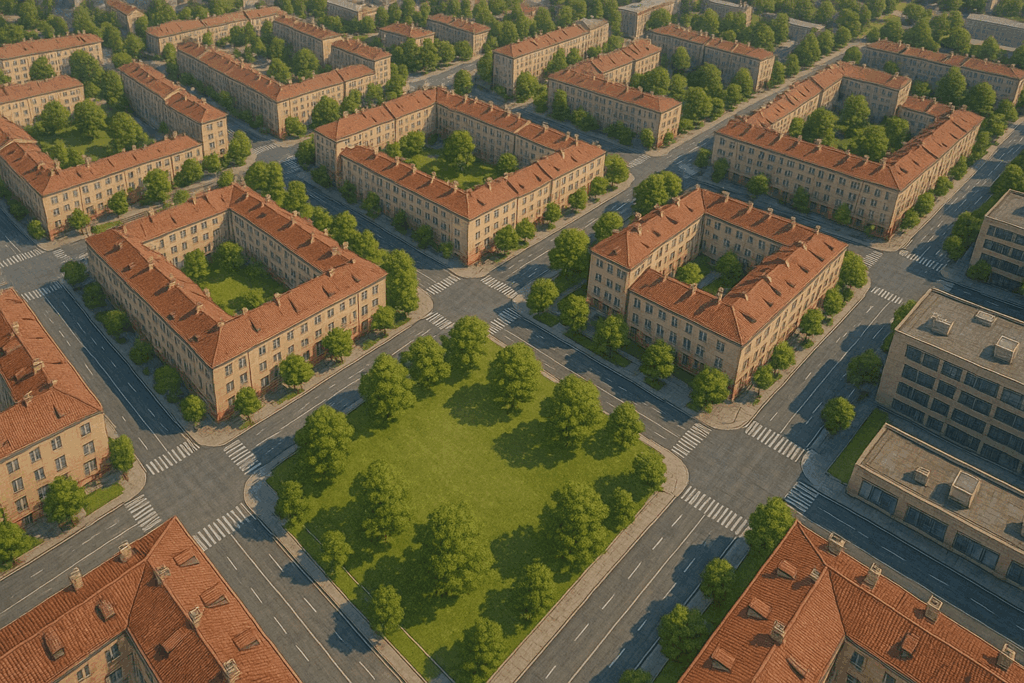 都市計画や景観設計では、鳥瞰パースが街全体の構成を表現するための主要な手段となります。道路・建物・緑地などを俯瞰的に配置し、将来の都市像を視覚的に示すことで、行政や住民との共有を容易にします。