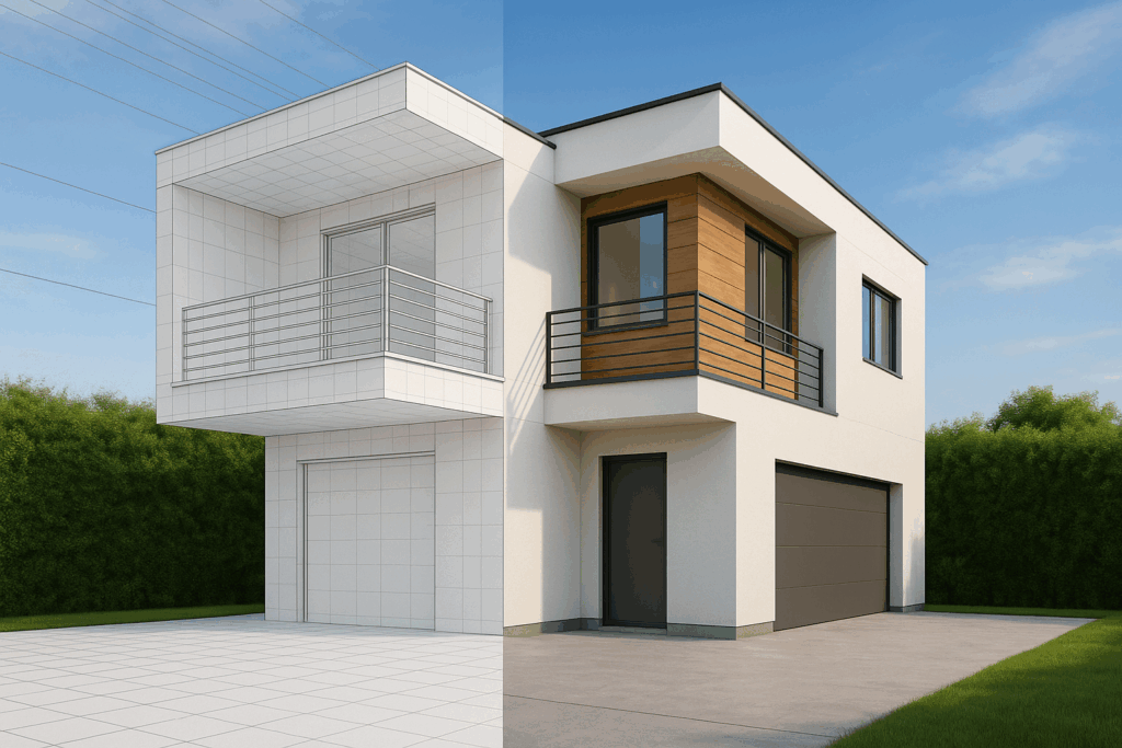 背景の空や植栽を合成することで、より自然な印象に仕上げることが可能です。最終的なビジュアル調整を丁寧に行うことで、説得力のあるCGパースが完成します。