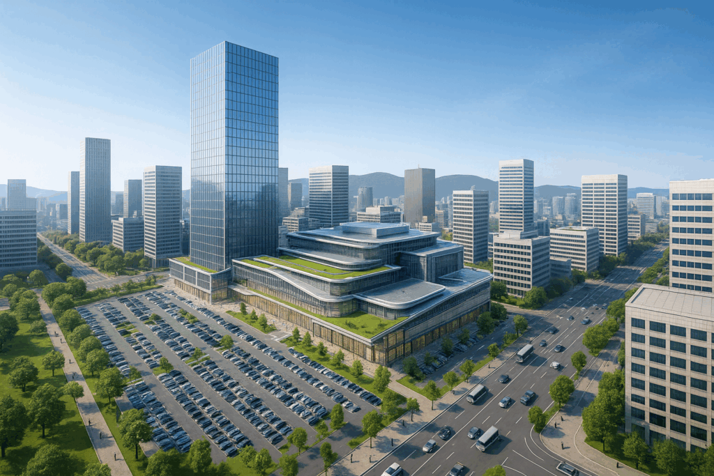 中規模の鳥瞰CGパースは、オフィスビル群や複数の建物が集まった商業施設などに使用されます。料金は15万〜30万円程度が相場で、視点の複雑さや周囲の環境の表現が求められるため、値段が上がりやすくなります。